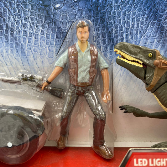 Jurassic World Owen “Alpha”, Motorcycle & Velociraptor “Blue” carded 3.75” action figures and vehicle (2015) Hasbro
